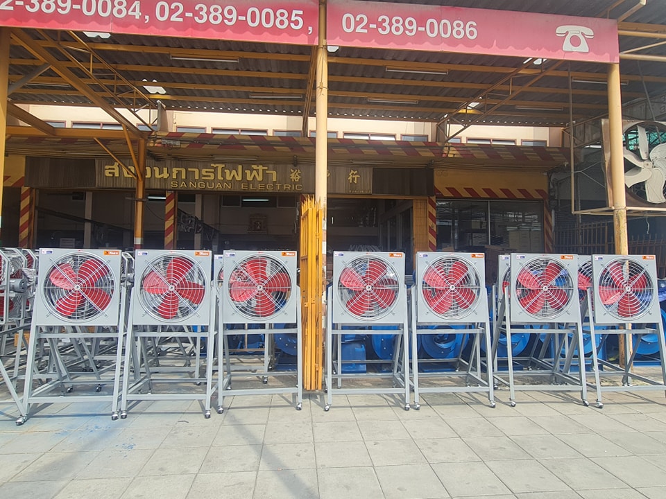 พัดลมราคาส่ง พัดลมโรงงานแบบทดสายพานมอเตอร์ 1สาย, 3สาย พัดลมใบแดงขนาด30นิ้ว และพัดลมใบแดงแบบมีขาตั้งล้อเลื่อนขนาด16นิ้วขึ้นไป
